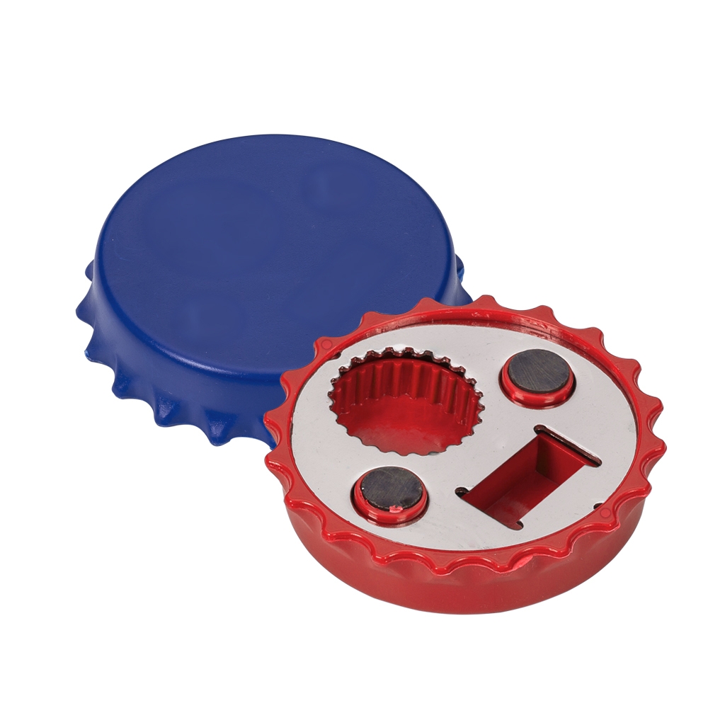 Abridor de garrafa formato tampa, material plástico resistente com imã de geladeira Parte traseira possui abridor tradicional e abridor para long neck
