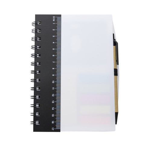 Bloco de anotações multiuso capa branca com espiral preto Possui: régua de 17cm na capa, porta cartão plástico, cinco blocos autoadesivos coloridos com 25 folhas cada, bloco amarelo com 25 folhas, 70 folhas pardas pautadas com logo reciclado no canto inferior direito e suporte elástico com caneta ecológica de papelão(clip e ponteira plástico)