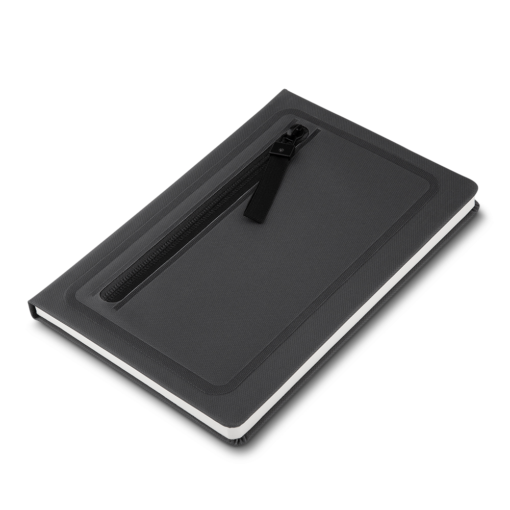 • Caderno de anotações com porta objetos na capa, capa dura em material sintetico, miolo 80 folhas pautadas na cor bege
