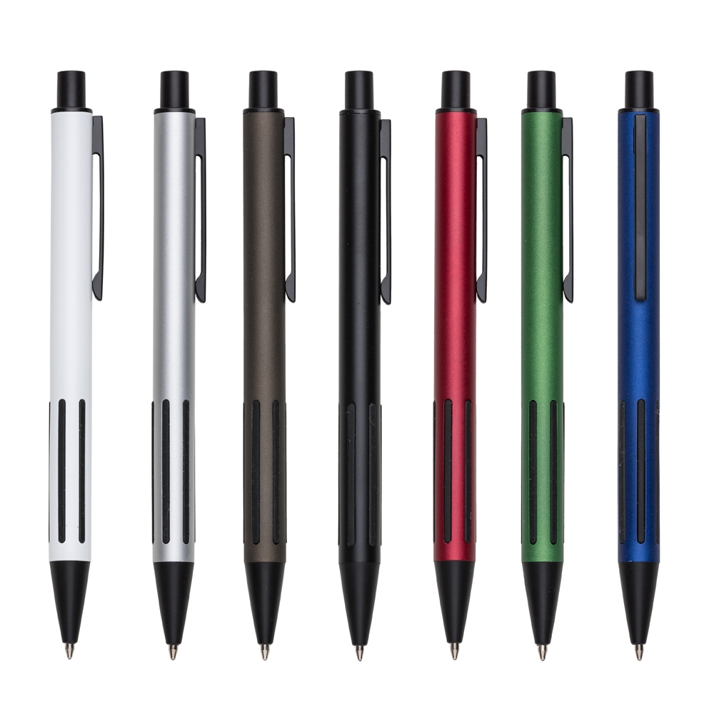 Caneta metal com pintura fosca e detalhes preto Clip metal, possui seis traços pretos emborrachados na parte inferior Aciona por clique OBS: PEDIDO APENAS MÚLTIPLO DE 50 PEÇAS!
