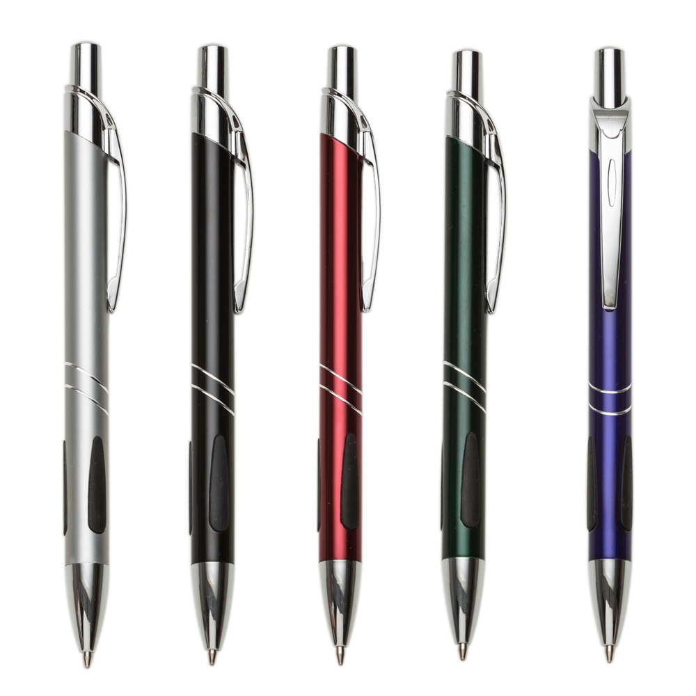 Caneta metal com detalhe emborrachado preto Caneta colorida com clip metálico com detalhe oval, possui dois anéis prata ondulados na parte inferior e três detalhes emborrachados ovais Aciona por clique