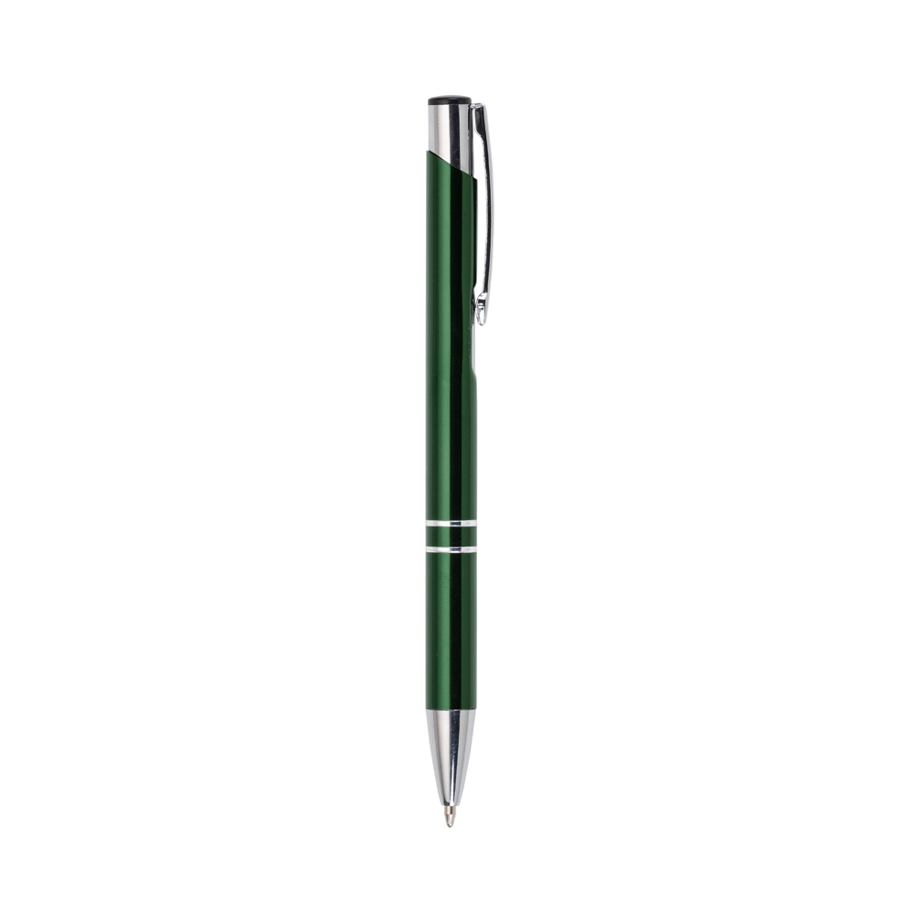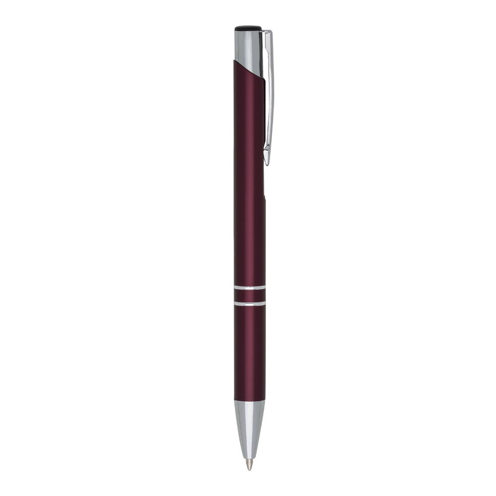 Caneta metal inteira colorida com detalhes prata Clip metal com a ponta do acionador preto, parte inferior com dois anéis prata Aciona por clique