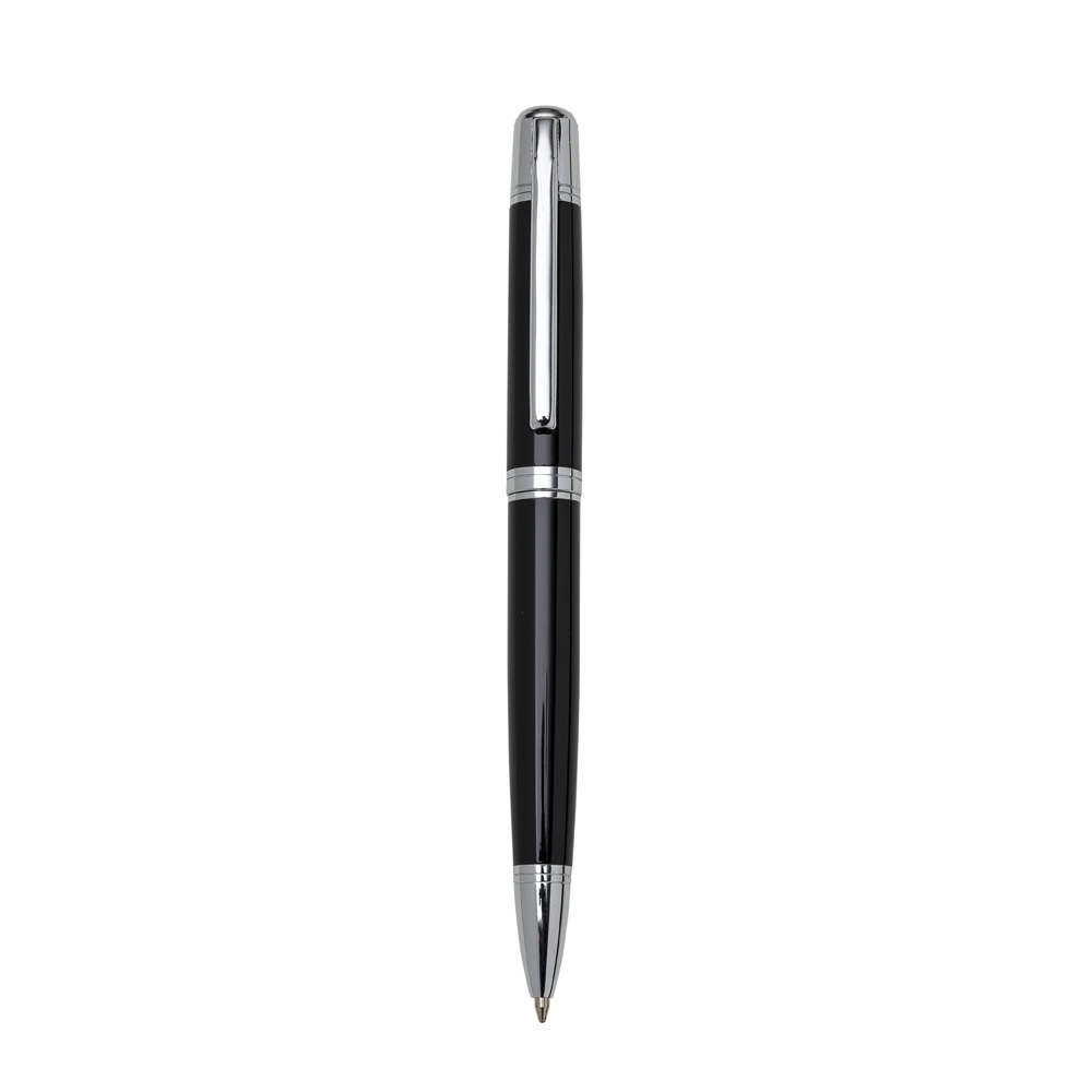 Caneta metal inteira colorida com detalhes prata Clip metal com dois anéis em relevo, anel centralizado e dois anéis em relevo na ponteira Aciona por giro