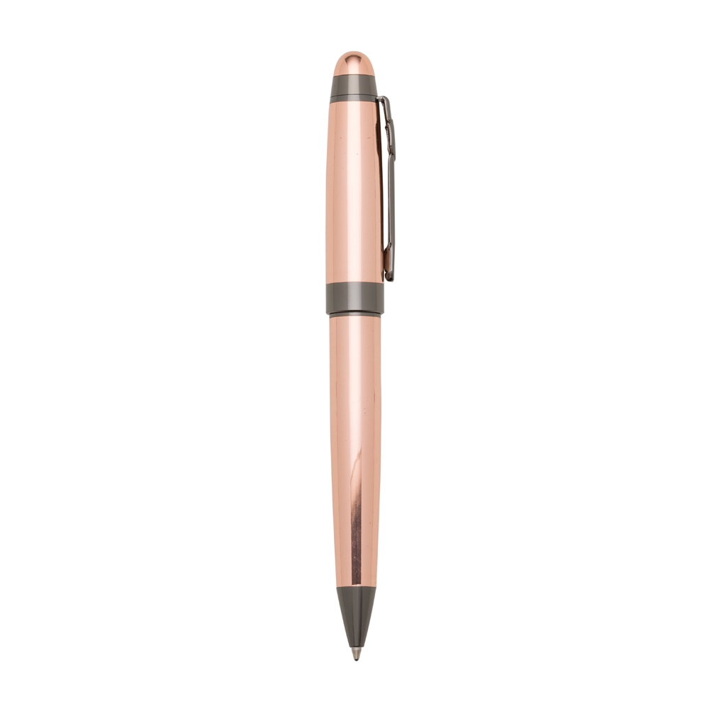 Caneta metal com detalhes coloridos Clip metálico com formato de um brasão na parte superior, possui anel superior, central e ponteira colorida Aciona por giro