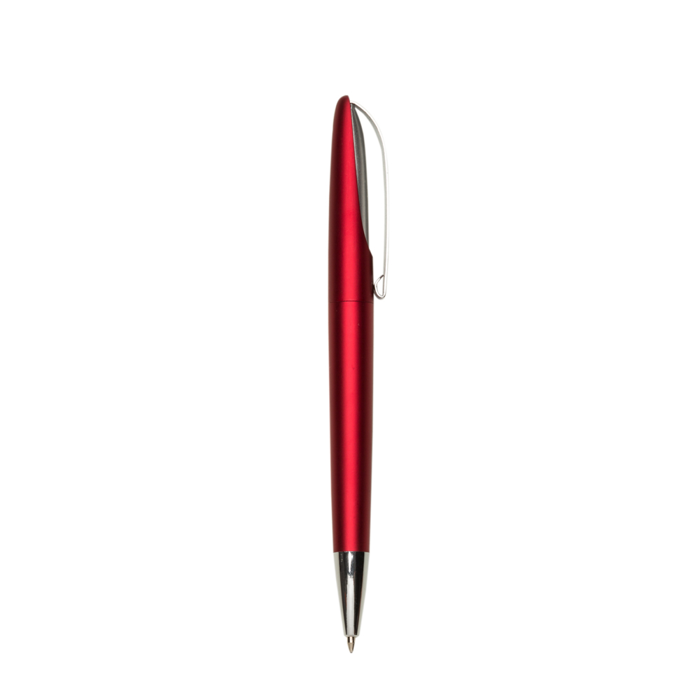 Caneta plástica brilhante inteira colorida com detalhes prata Clip metal, basta pressionar o clip para acionar a esferográfica