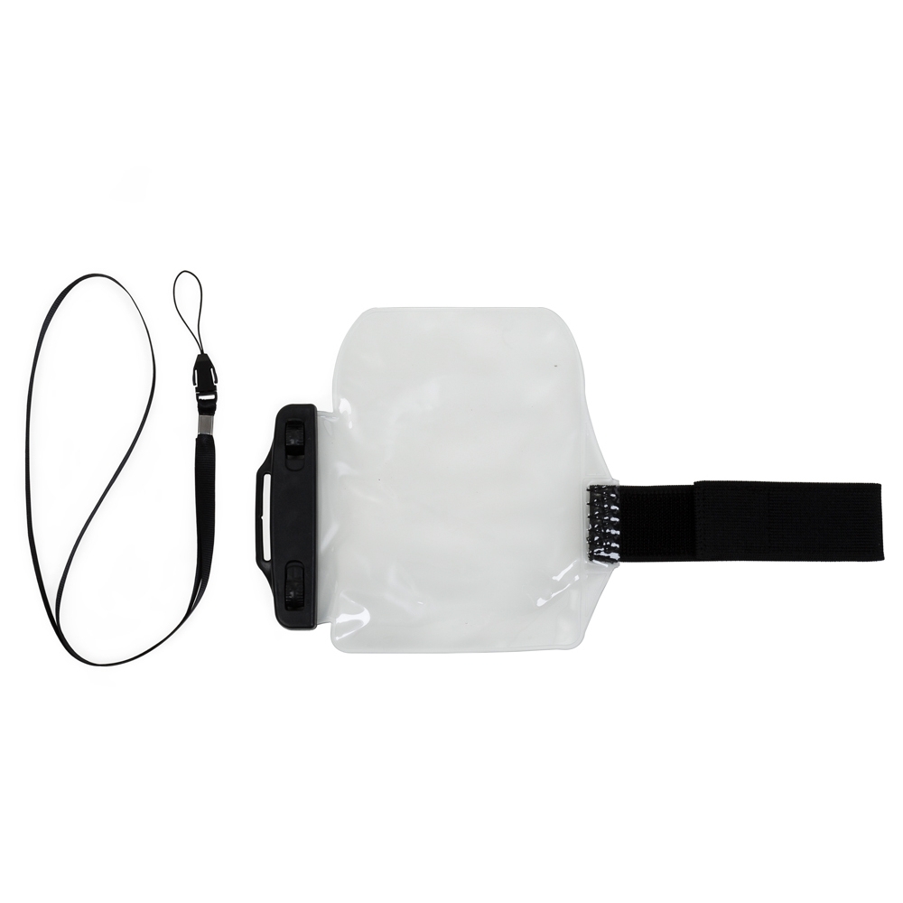Capa braçadeira impermeável para celular Parte frontal transparente e verso fosco, suporte plástico superior com fivelas rotatórias(basta rotacioná-las para abrir o case) Possui na lateral fita elástica com velcro para e acompanha cordão de cetim