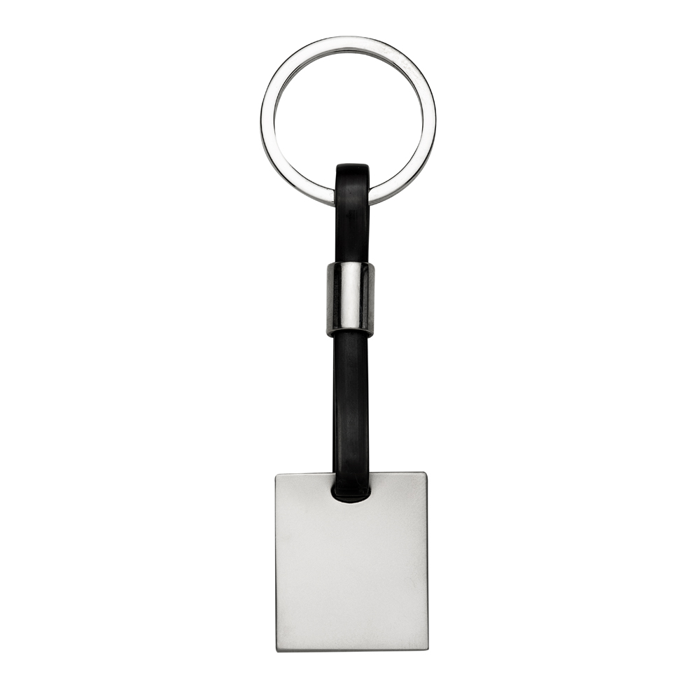Chaveiro de metal retangular de frente e verso liso, possui anel no centro e cordão emborrachado