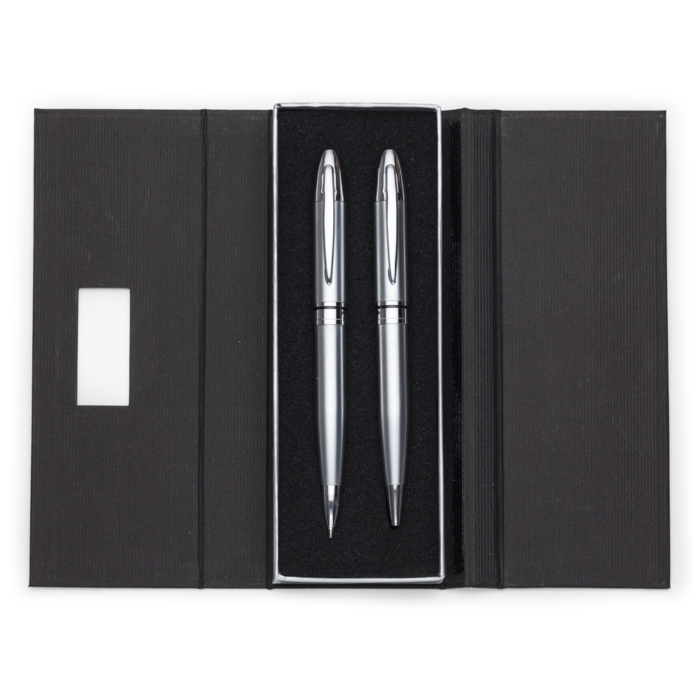 Conjunto caneta e lapiseira em estojo de cartonagem com placa central para personalização Clip metal e anel central possui: anel fino prata, anel preto fino e um anel maior prata com relevo e acionam por giro Estojo revestida com espuma na parte interna