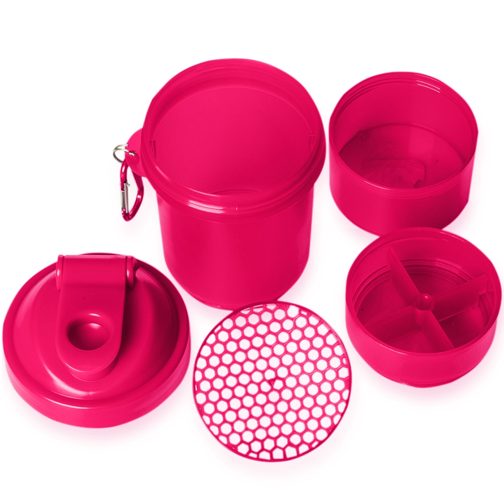 Coqueteleira 400ml plástica porta suplementos desmontável Possui: copo 400ml(medida em ml e oz), compartimento com divisória para comprimidos, compartimento para armazenar shake/suplemento em pó, sendo todos estes rosqueáveis e possível guardar os dois compartimentos dentro do copo Acompanha peneira, mosquetão, tampa de rosca e trava na própria tampa(basta levantar para beber)