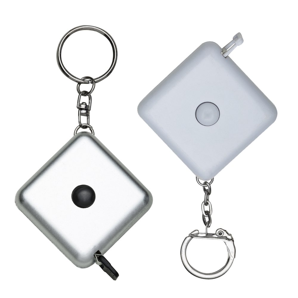 Fita métrica de 1 metro em plástico quadrangular, frente lisa e verso com botão(trava) preto Acompanha chaveiro