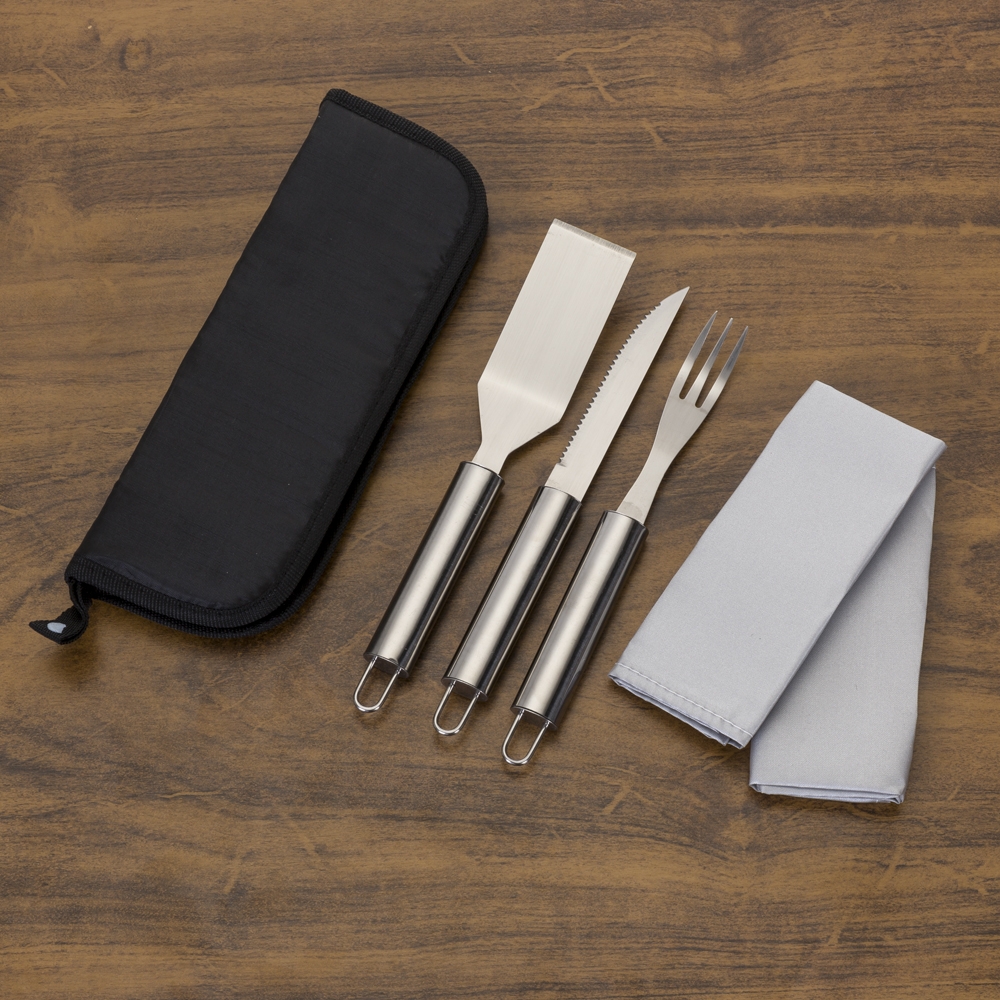 Kit churrasco com 5 peças em estojo de nylon com alça Possui: 2 jogos americanos, espátula, faca e garfo Acompanha proteções plásticas e parte interna com elástico para guardar as peças
