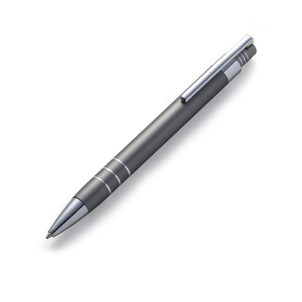 Lapiseira metal inteira colorida com detalhes prata Clip metal e com três anéis na parte superior e outros três na parte inferior Aciona por clique