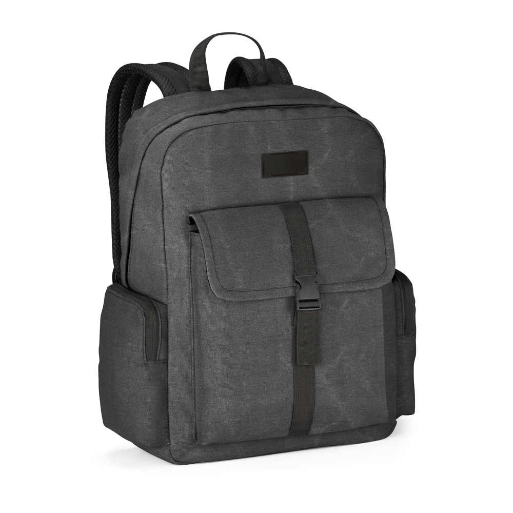 Mochila para notebook Algodão canvas pré-lavado Compartimento forrado, com 2 divisórias almofadadas para notebook até 156 e tablet 105 Bolso frontal e 2 bolsos laterais Parte posterior e alças almofadadas Com alça para transporte em trolley e placa em c sintético para personalização