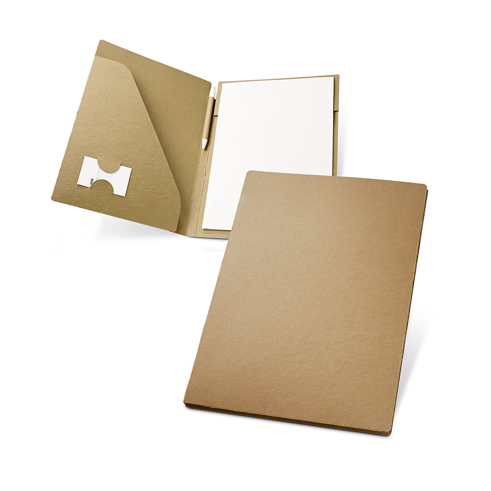 Pasta A4 Cartão: 450 g/m² Bloco: 20 folhas não pautadas de papel reciclado Incluso esferográfica