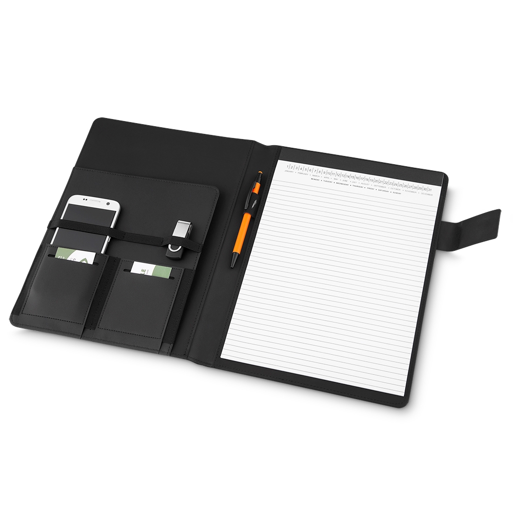 Pasta convenção de tecido sintético, possui fecho magnetizado com plaquinha para personalização em preto fosco Parte interna com compartimento grande para arquivar documentos,três divisórias elásticas, duas divisórias para celular e cartões, suporte elástico para caneta e bloco com aproximadamente 20 folhas brancas pautadas com dias do mês na área superior