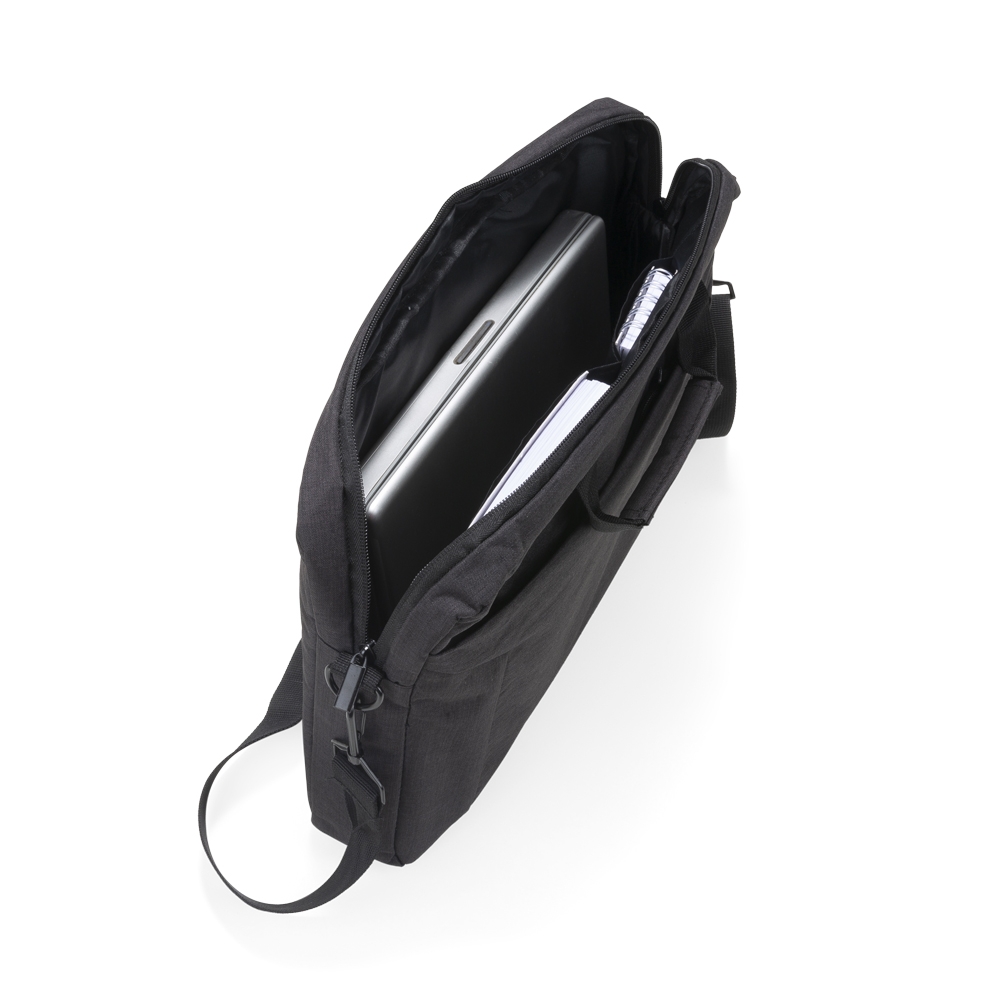 Pasta executiva de nylon com alça para uso transversal Compartimento superior grande, possui dois bolsos internos para documentos; compartimento médio lateral com divisória para documentos e canetas; possui alça transversal ajustável e alça de mão