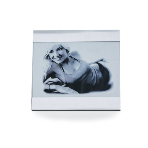 Porta retrato com duas chapas metálicas(superior e inferior) que podem ser removidas Possui uma tela de vidro e parte traseira(apoio) revestido de veludo, acompanha película protetora Tamanho da fotografia de 15 cm x 13 cm OBS: PEDIDOS MÍNIMOS DE 72 PEÇAS!