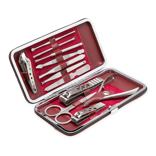 Kit manicure 12 peças em estojo de couro sintético texturizado, contém: 2 cortadores de unha, alicate de cutícula, tesoura, lixa, removedor de cutícula, pinça, espátula, palheta de orelha, 2 empurradores de cutícula e cortador de cutícula